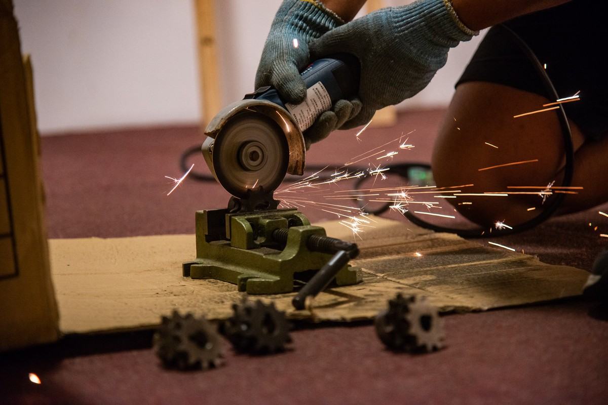 We were inspired by the "Dragon Bone Waterwheel," a traditional tool used by Hakka people during the farming era. The sound of its rolling wooden sections inspired us. We used modern metal axles and chain structures to recreate traditional irrigation and farming activities.