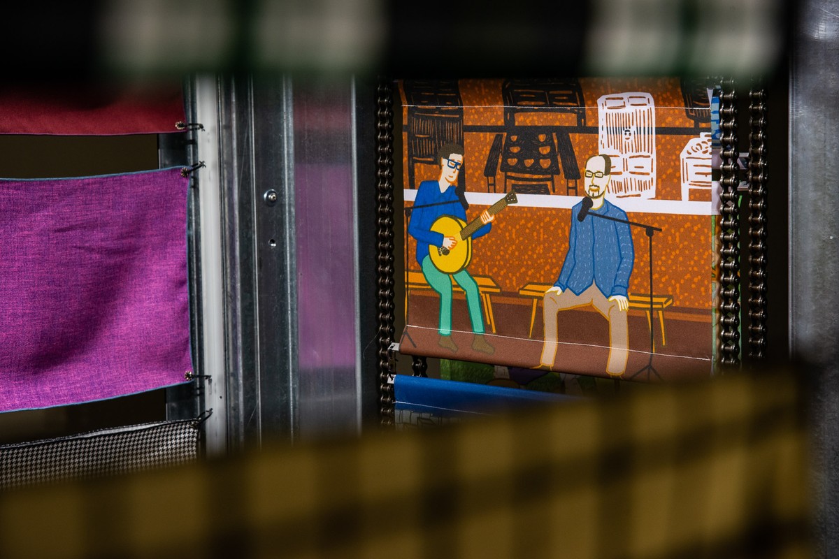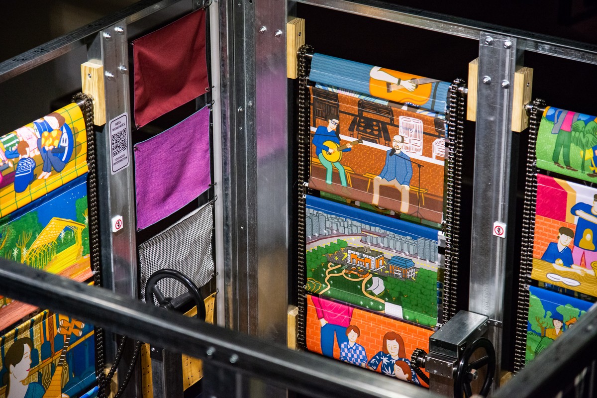 On the scroll mechanism, you can see paintings printed on translucent fabric. The slight dye effect combines digital printing with traditional blue dye techniques. You can see scenes from the Taipei Hakka Cultural Park, such as bamboo trellises, sculptures, and public art.