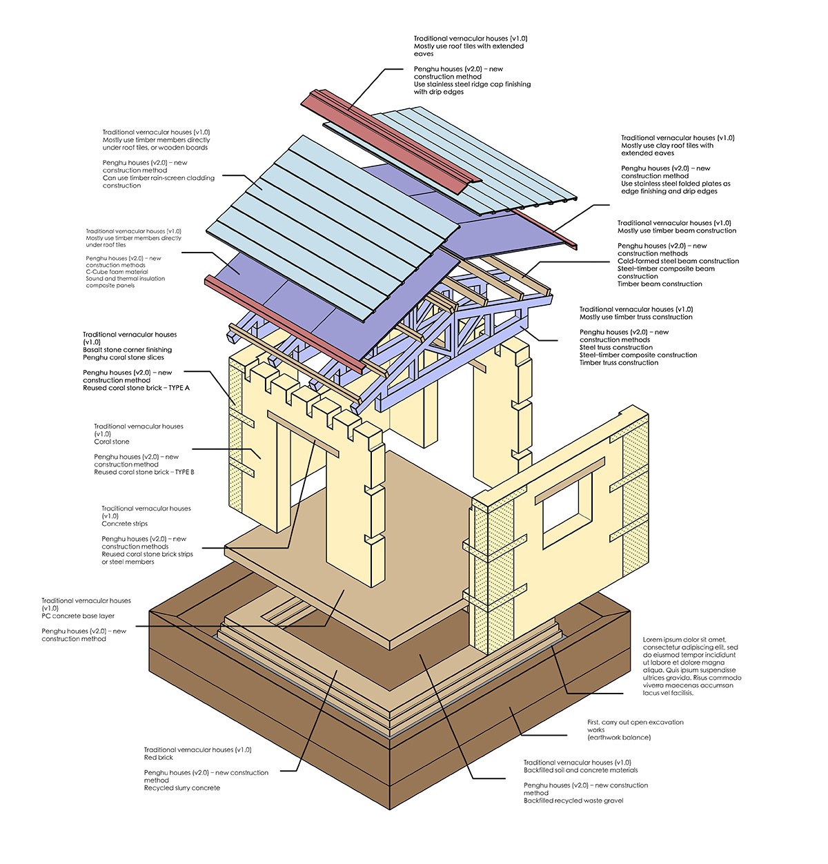 Based on this approach, we further constructed a “Circular House.” Its architectural form and construction methods are fully based on traditional Penghu vernacular houses, using load-bearing walls as the main structural system. This design responds to the local climate and traditional building wisdom. At the same time, by combining new materials with traditional construction techniques, we hope to support the transformation and continuation of the local craft and construction system.