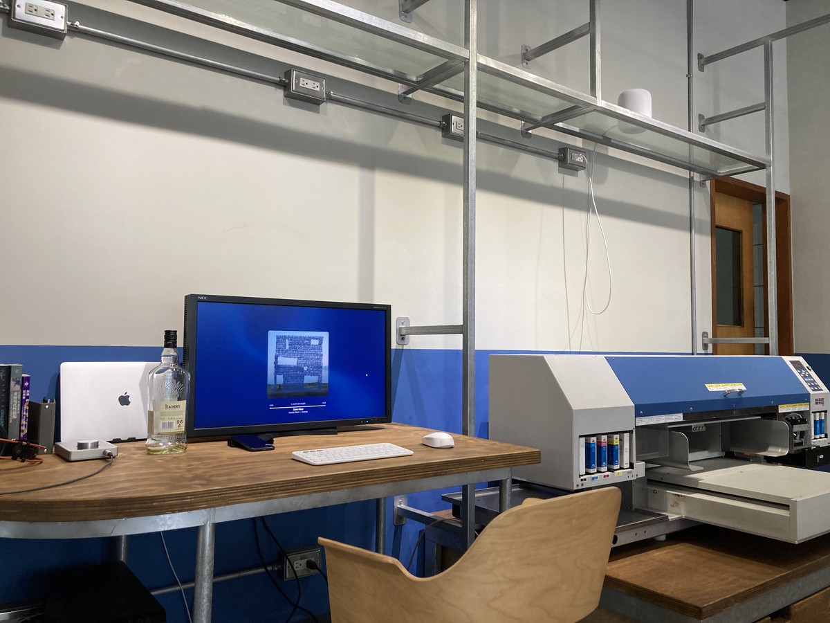 We reviewed reusable furniture within the store and decided to retain the existing oak-colored furniture and panels. We paired these with the main colors of the printing machines restored by the owners—blue, silver, and light gray—to create a composite space that is slightly cool and experimental.
