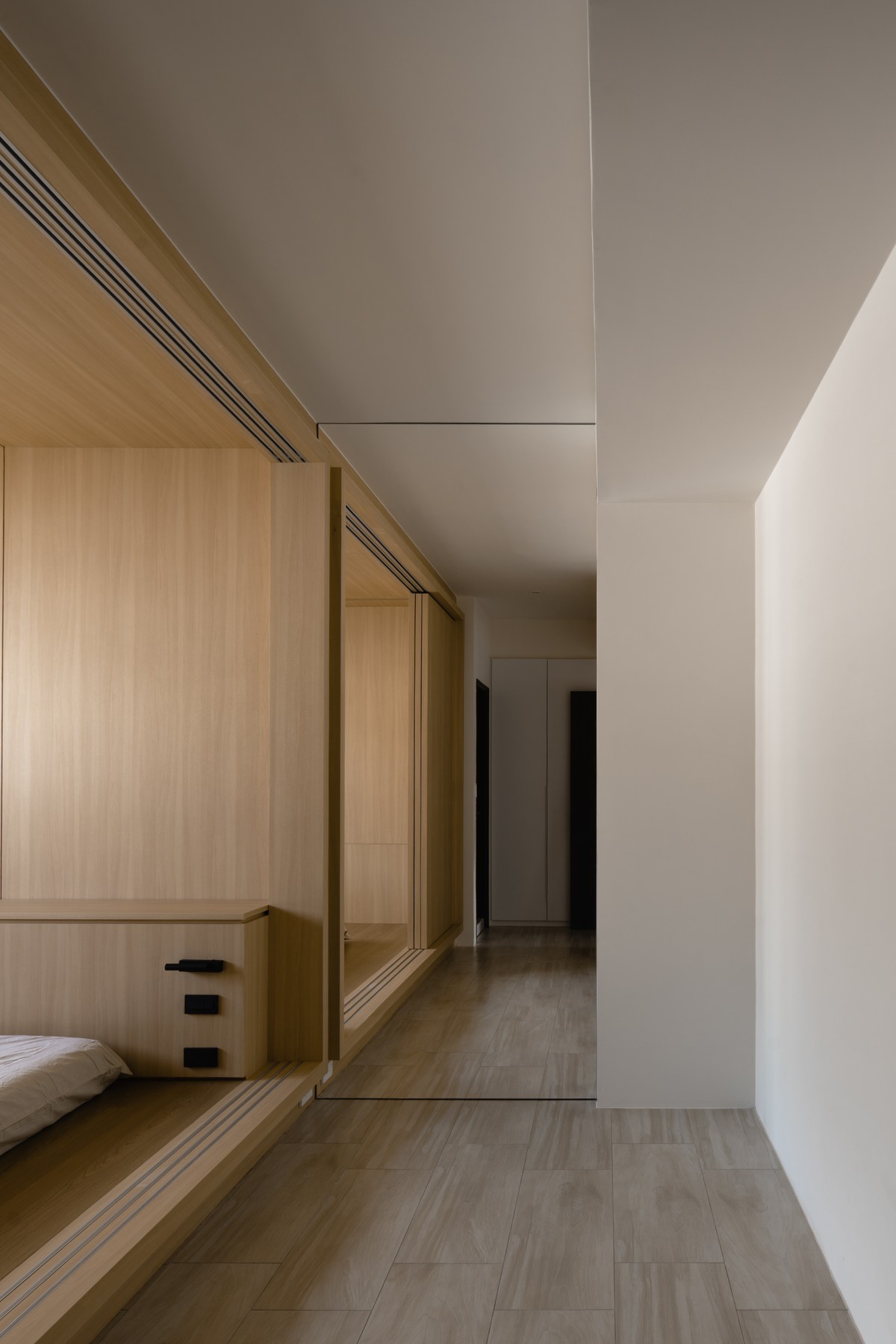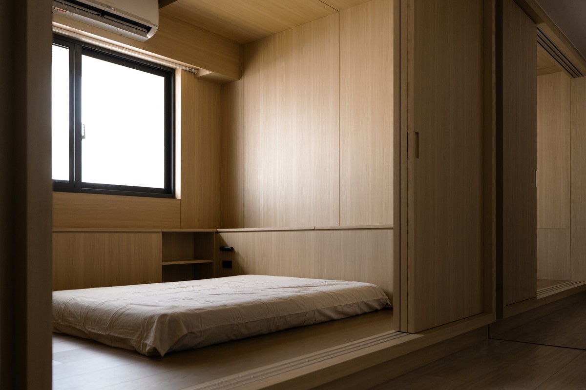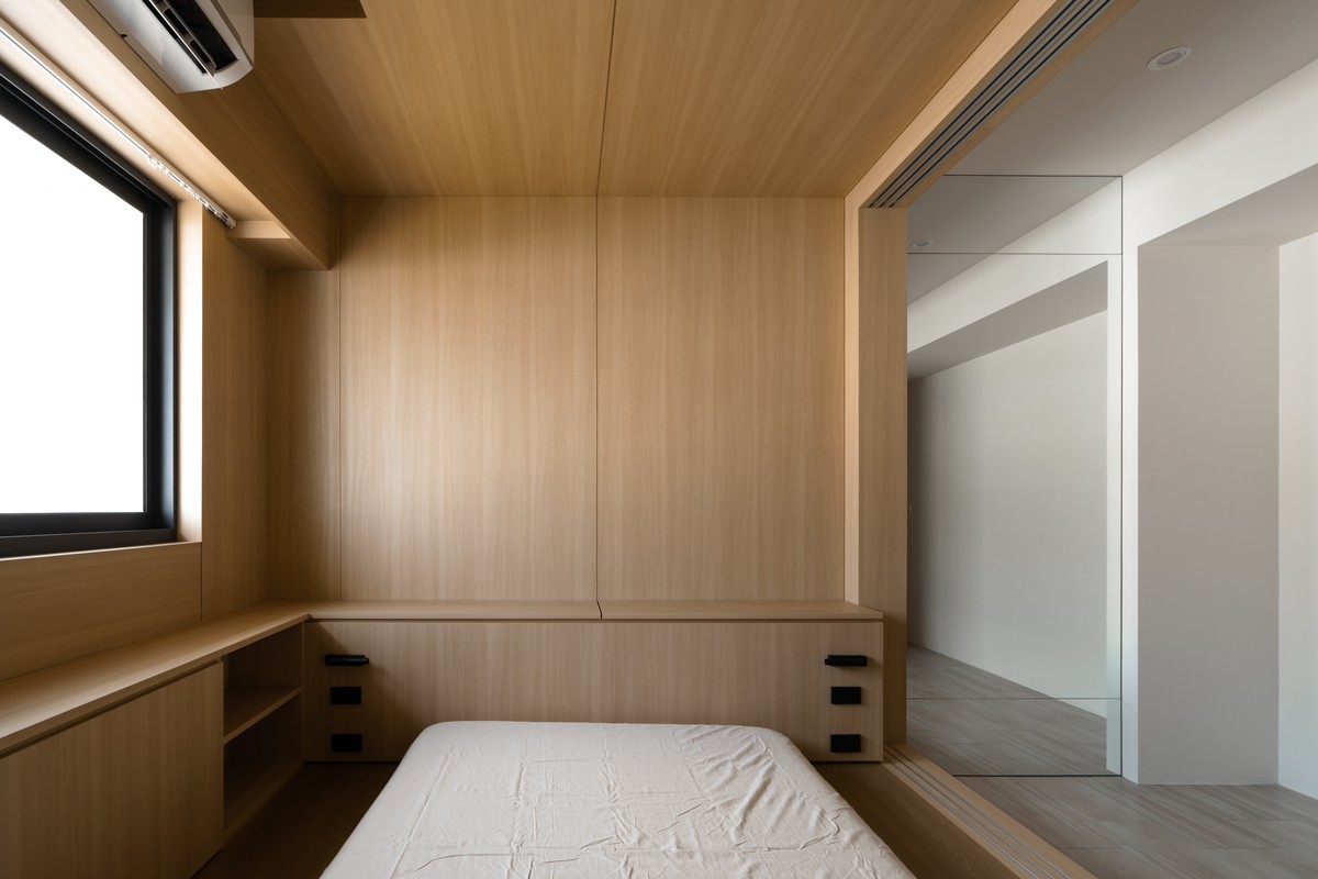 The core of the space is a "house within a house" structure made of light oak wood. This structure creates a private and safe area in the open floor plan. The owner can relax on the bed and watch shows with a projector, letting their mind and body rest in the warm wood environment after busy work. Wood materials provide not only visual warmth but also a sense of security and belonging.